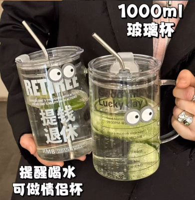Large capacity 1000ml high borosilicate glass tea cup for women, office and home use, new style straw cup.