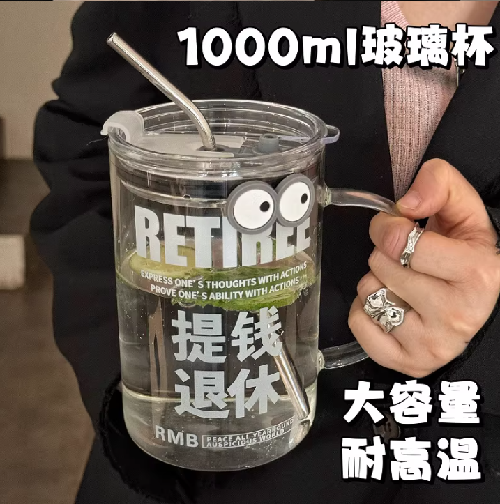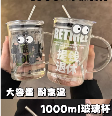 Large capacity 1000ml high borosilicate glass tea cup for women, office and home use, new style straw cup.